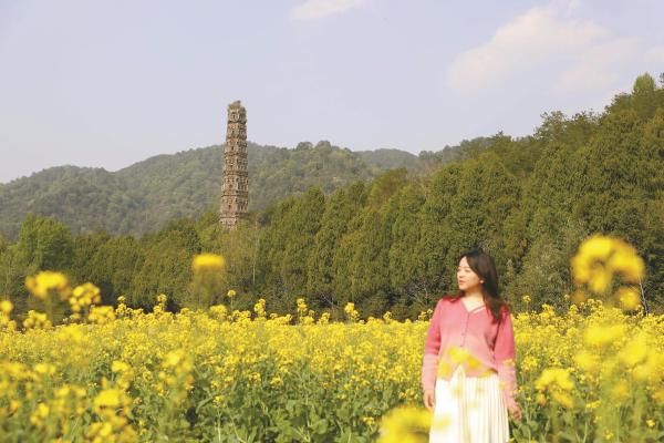 在东钱湖陶麓街区的网红墙前打卡。