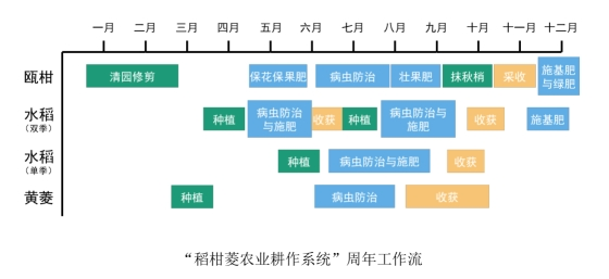 比如,黄菱与早籼稻的种植时间分别为3月头尾,二者之间不冲突,同时与瓯柑春季清园修剪工作不冲突。